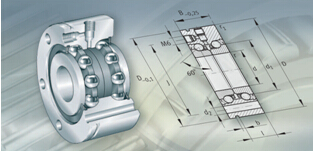 單列角接觸球軸承中,滾道的設計形式使作用力與徑向平面傾斜,并以特定的接觸角度從一個滾道傳遞至另一個滾道。軸向承載能力隨接觸角的增大而增大。由于單列角接觸球軸承具有較大的接觸角,因此,同深溝球軸承相比,更適于承受較大的單向軸向力。單列角接觸球軸承能夠承受徑向載荷和單向的軸向力。它們可以通過另一個反向安裝的軸承進行調節。 雙列角接觸球軸承的設計類似于一對O 型布置的單列角接觸球軸承。在這種情況下,軸承壓力線的頂角指向外部。雙列軸承能夠承受較大的徑向力及雙向的軸向力并且特別適用于實現軸向剛性引導的軸承布置。根據不同系列,軸承可以設計帶有或不帶裝球缺口。